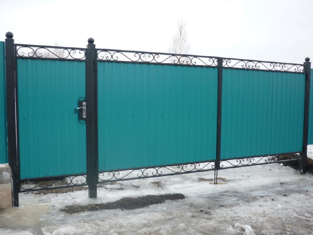 Ворота распашные с дистанционным управлением из профнастила с калиткой